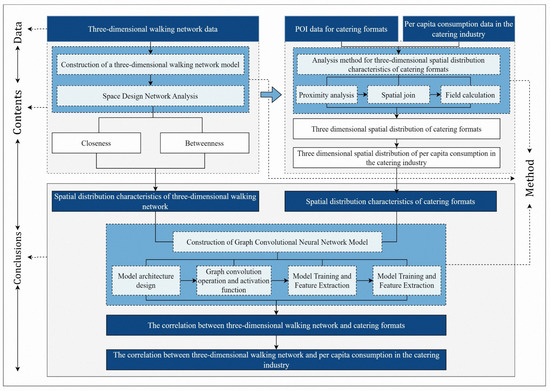 To determine the correlation characteristics between the three-dimensional pedestrian network and catering formats, we conducted field surveys to obtain and map the three-dimensional pedestrian network model of Xinjiekou in Nanjing and constructed a research framework to explore the correlation between the three-dimensional pedestrian network and catering formats (Figure 2). This framework mainly consists of three parts. First, we constructed a three-dimensional pedestrian network model for the central area of Xinjiekou, obtaining characteristic information about the three-dimensional pedestrian network by analyzing network closeness and betweenness. Next, we proposed an analysis method for the spatial distribution characteristics of catering formats in three-dimensional spaces to examine the distribution of catering formats in such spaces. Finally, we built a graph convolutional neural network model to analyze the correlation between variables of the three-dimensional pedestrian network and the characteristics of catering formats, investigating the correlation characteristics between the three-dimensional pedestrian network and catering formats in the central area of Xinjiekou.