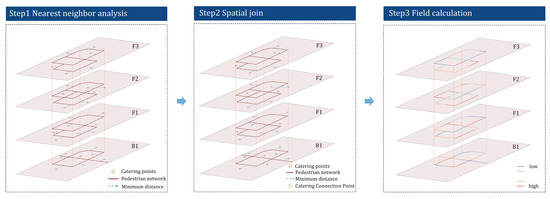 However, existing research primarily focuses on analyzing the spatial relationship between pedestrian networks and the layout of the catering format in two-dimensional space. For example, the studies by Li et al. (2020) [13], Wang et al. (2019) [14], and Njomo (2018) [15] offer valuable insights but fail to fully reveal the interactions and relationships between catering formats and transportation in three-dimensional space. This limitation constrains the application of urban planning in high-density vertical spaces. Thus, there is an urgent need for a method that can analyze the spatial relationship between pedestrian networks and the layout of catering formats in three-dimensional space to better guide the rational utilization and optimization of urban space.
