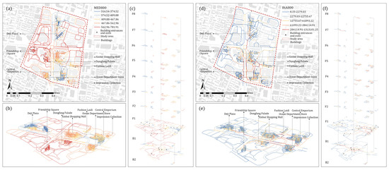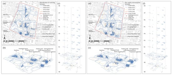 Distribution of catering formats in Xinjiekou: (a) Two-dimensional spatial distribution of catering formats; (b) Three-dimensional spatial distribution of catering formats; (c) Spatial distribution of catering formats on different floors; (d) Two-dimensional spatial distribution of per capita consumption in the catering formats; (e) Three-dimensional spatial distribution of per capita consumption in the catering formats; (f) Spatial distribution of per capita consumption in the catering formats on different floors.