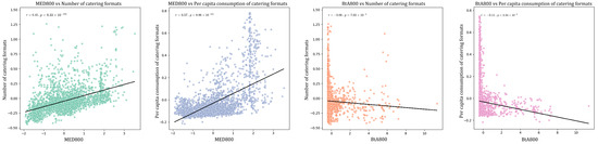 On the contrary, there is a negative correlation between pedestrian network betweenness centrality and both the number of catering formats and per capita consumption levels, with a low correlation coefficient. This indicates that betweenness centrality has almost no significant correlation with the number of catering formats and per capita consumption. Nodes with high-betweenness centrality typically handle more traffic flow and connection functions. These areas may be less favorable for the concentration of catering formats and high consumption levels due to factors such as high traffic flow and noisy environments. Therefore, in areas with high-betweenness centrality, the number of catering formats and per capita consumption levels are relatively low. However, given the correlation coefficient is close to zero, it can be considered that betweenness centrality does not significantly impact catering formats and consumption levels.