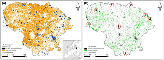 Small mammal trapping sites in Lithuania, 1975–2023, with indication of agricultural areas (A), and positions of the case study sites (B), with indication of grasslands: 1—Žagarė forest and Žagarė Regional Park, 2—vicinity of Biržų Giria forest, 3—Dzūkija National Park, 4—Ignalina region, 5—Žemaitija National Park, 6—Lipliūnai environs, 7—Zarasai region, 8—Rusnė environs.