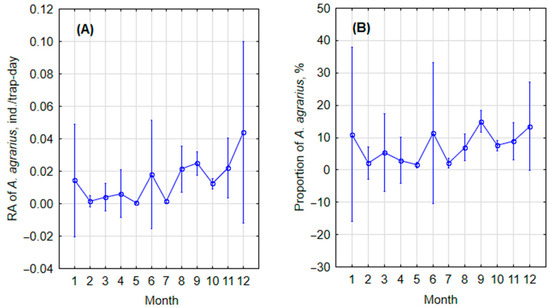Relative abundances (A) and proportions of A. agrarius in the small mammal community (B) by month. Vertical bars denote 95% CI.