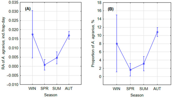 Relative abundances (A) and proportions of A. agrarius in the small mammal community (B) by season. Vertical bars denote 95% CI.