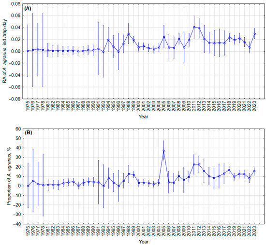 We did not observe regular changes in annual RA of A. agrarius during 1975–2023 in Lithuania. Until 1993 RA was very low, close to zero, during 1994–2000 two three-year long cycles were observed, and in the last two decades, fluctuations were noticeable but irregular (Figure 4A).