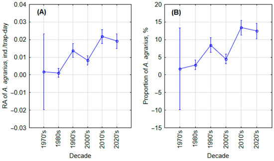Relative abundances (A) and proportions of A. agrarius in the small mammal community (B) by decade. Vertical bars denote 95% CI.