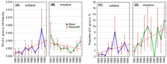 Relative abundances (A,B) and proportions (C,D) of A. agrarius in the small mammal community in wetlands and meadows of Site 4, 1981–1990. Red lines indicate trends. Vertical bars denote SE.