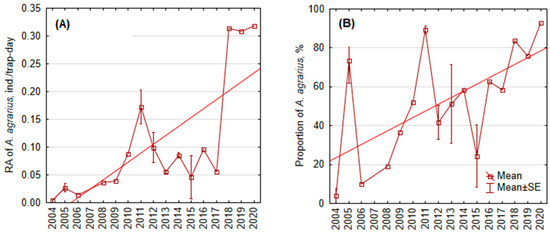 Relative abundances (A) and proportions (B) of A. agrarius in the small mammal community in flooded meadows of Site 8, 2004–2020. Red lines indicate increasing trends. Vertical bars denote SE.