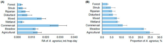 The commensal habitat stood out in terms of the highest A. agrarius RA, outperforming all other habitats (post hoc, p < 0.05), except the mixed habitats (Figure 8A). Mixed, agricultural, and meadow habitats were characterized by intermediate RA (within group, differences in RA not significant). Forest, shrub, riparian, wetland, and disturbed habitats were characterized by the lowest RA, with no within-group differences. Covariates such as decade and season of capture were considered.
