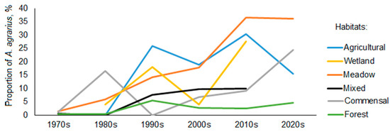 In Site 7, the increase in A. agrarius RA was 4.3, that of proportion 7.4 times comparing two decades, 2000s and 2010s, and the species was equally present in forest fragments, commensal and meadow habitats (36, 30 and 39 individuals, respectively).