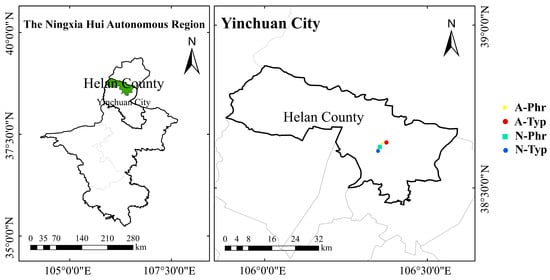 Figure 2. The geographical location and distribution of the sample plots in various restored stands. A-Phr, artificially cultivated ditch with P. australis rhizosphere sediment; A-Typ, artificially cultivated ditch with T. orientalis rhizosphere sediment; N-Phr, natural ditch with P. australis rhizosphere sediment; N-Typ, natural ditch with T. orientalis rhizosphere sediment. The green section in the left figure denotes Helan County.
