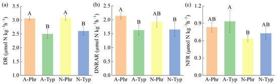 Figure 3. Nitrogen denitrification rate (a), dissimilatory nitrate reduction to ammonium rate (b), and nitrogen fixation rate (c) in all sediment samples. DR is the nitrogen denitrification rate, DNRAR is the dissimilatory nitrate reduction to ammonium rate, and NFR is the nitrogen fixation rate. The different capital letters indicate significant differences among the different rhizosphere sediment samples (p < 0.05) according to one-way ANOVA and LSD.