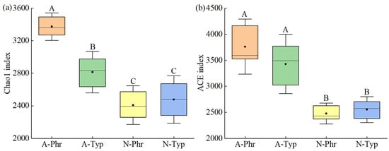 A total of 144,287 high-quality sequences were obtained through 16S rRNA sequencing, with each library containing a varying number of sequences ranging from 10,177 to 14,218. The coverage rate for all the samples exceeded 96%. Utilizing a sequence similarity threshold of >97%, high-quality reads were grouped into 5411 microbial operational taxonomic units (OTUs), resulting in a total of 109,493 sequences (Figure S1). The Chao1 and ACE richness indices of the A-Phr and A-Typ bacterial communities were significantly greater than those of the N-Phr and N-Typ bacterial communities (Figure 4a,b). In contrast, the Shannon diversity index of N-Typ was notably greater than that of N-Phr (Figure 4c).