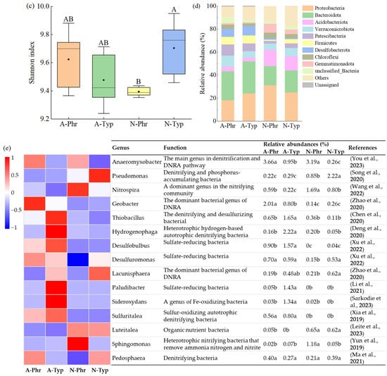 Figure 4. Alpha diversity indices, including Chao1 (a), ACE (b), and Shannon (c) indices; relative abundance of bacteria at the phylum level (d); and functional and relative abundance of bacteria involved in the nitrogen cycle at the genus level (e) in different rhizosphere sediment samples. The different capital/lowercase letters indicate significant differences among the different rhizosphere sediment samples (p < 0.05) according to one-way ANOVA and LSD [59,60,61,62,63,64,65,66,67,68,69,70,71].