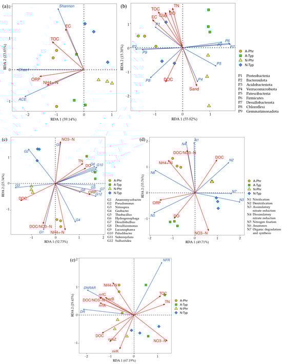 Figure 5. Redundancy analysis (RDA) was used to identify relationships among nitrogen conversion rates and microbial and environmental factors. (a) The alpha diversity index of bacteria and environmental factors; (b) the phylum level of bacteria and environmental factors; (c) the genus level of bacteria and environmental factors; (d) the nitrogen cycling pathways and environmental factors; (e) the nitrogen conversion rates and their environmental and microbial factors. DO is the dissolved oxygen in water; ORP is the oxidation–reduction potential in water; EC is the electrical conductivity of the sediments; TOC is the total organic carbon in the sediments; DOC is the dissolved organic carbon in the sediments; TN is the total nitrogen in the sediments; NH4+-N is the ammonium nitrogen in the sediments; NO3-N is the nitrate nitrogen in the sediments; DOC/NO3-N is the ratio of dissolved organic carbon to nitrate nitrogen in the sediments; and sand is the sand content (the sediment particle size fraction is 2~0.02 mm) in the sediments.