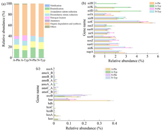 The relative abundances of genes involved in A-Phr denitrification (napA, norB), dissimilatory nitrate reduction (nrfC, nrfA), nitrification (hao), and anammox (hzsA, hzsC) were significantly greater in A-Phr than in A-Typ, N-Phr, and N-Typ (p < 0.05). Among these genes, the norB, nrfC, nrfA, hao, hzsA, and hzsC genes were all significantly positively correlated with the NH4+-N content and DOC/NO3-N ratio (p < 0.01) but negatively correlated with the NO3-N content (p < 0.01) (Figure 6b,c; Table S4). The relative abundances of nitrogen fixation genes (nifD, nifK, nifH) in A-Typ were significantly greater than those in A-Phr, N-Phr, and N-Typ (p < 0.05) and showed a significant positive correlation with the ORP-W and DO-W content (p < 0.05). The relative abundances of denitrification (nirK, nosZ, nirS) genes in N-Phr were significantly greater than those in A-Phr, A-Typ, and N-Typ (p < 0.05) and displayed a significant negative correlation with the TOC and TN contents, the ORP-W, and the DO-W content (p < 0.05), among which the nirK and nosZ gene abundances were significantly positively correlated with the DOC content (p < 0.05) (Figure 6b, Table S4).