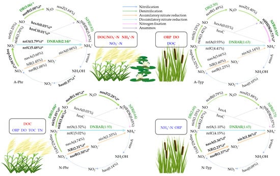 Figure 7. Schematic diagram of nitrogen cycling at the gene level in different rhizosphere sediment samples from drainage ditches. DR is the nitrogen denitrification rate; DNRAR is the dissimilatory nitrate reduction to ammonium rate; NFR is the nitrogen fixation rate; DO is the dissolved oxygen in water; ORP is the oxidation–reduction potential in water; TOC is the total organic carbon in the sediments; DOC is the dissolved organic carbon in the sediments; TN is the total nitrogen in the sediments; NH4+-N is the ammonium nitrogen in the sediments; NO3-N is the nitrate nitrogen in the sediments; and DOC/NO3-N is the ratio of dissolved organic carbon to nitrate nitrogen in the sediments. The green numerical values within parentheses denote the different rates, with units of μmol N kg−1 h−1. The black numerical values within parentheses after the genes of various functions denote their respective relative abundance. * indicates significant differences among the different rhizosphere sediment samples (p < 0.05).