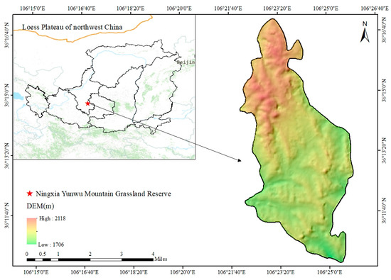 The experiment was conducted in September 2020 at the Yunwu Mountain Grassland Nature Reserve (106°24′–106°28′ E, 36°13′–36°19′ N), located in Guyuan City, Ningxia Hui Autonomous Region, in the northwestern part of the Loess Plateau (Figure 1). This region is characterized by a typical semi-arid climate, featuring drought, low and concentrated rainfall from June to September, large temperature variations, and long sunshine duration. The annual mean temperature is 5 °C in the region, with the hottest month being July, where temperatures range between 22 °C and 25 °C. The coldest month is January, with an average minimum temperature of approximately −14 °C. The annual average precipitation is 445 mm. The region, with an elevation ranging from 1700 to 2120 m, is a typical low mountain and hill region covered by loess. The soil types, according to the FAO classification system, include Calcaric Cambisols, Calcic Luvisols, and Chernozem [19]. These included plots enclosed for 2 years (G2a), 14 years (G14a), 30 years (G30a), and 39 years (G39a). Basic information about the sample plots is presented in Table 1.