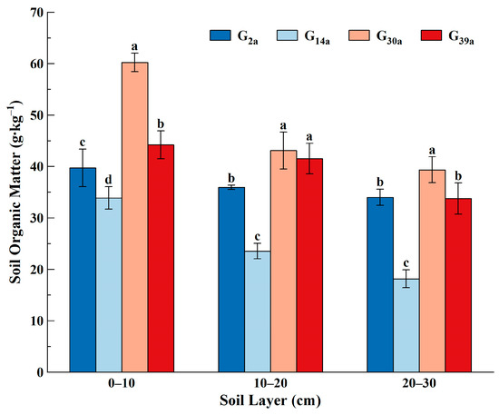 Soil organic matter content of grassland in different depths and different enclosure years. G2a, enclosure of grassland for 2 years; G14a, enclosure of grassland for 14 years; G30a, enclosure of grassland for 30 years; G39a, enclosure of grassland for 39 years. Note: Different lowercase letters indicate the significant differences between different depths of each plot (p < 0.05).