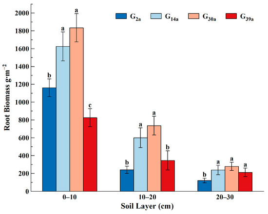 As illustrated in Figure 3, the root biomass of all sample plots exhibited an overall decreasing trend with increasing soil depth. In the soil depth ranging from 0 to 10 cm, the root biomass was determined to follow the order G30a > G14a > G2a > G39a, which was statistically significant (p < 0.05). Within the 0–10 cm soil layer, the root biomass of G30a was measured to be 1833.50 g·m−2, representing a 1.22-fold increase compared to that of G39a at the same depth (p < 0.05). However, no significant difference was observed between G30a and G14a. At a soil depth ranging from 20 to 30 cm, the root biomass of G30a experienced a reduction of 84.82%, while that of G39a decreased by 74.44%. At this particular soil depth, the root biomass of G2a was determined to be 119.96 g·m−2, indicating an 89.66% decrease in comparison to the 0–10 cm soil layer and being notably lower than the root biomass recorded for the other sample plots at this depth.