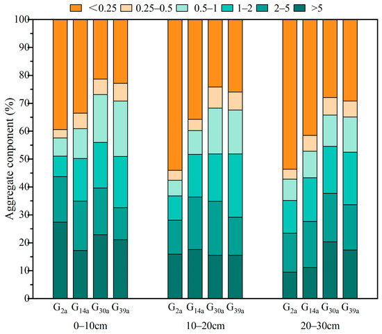 Composition of soil aggregates in grasslands with different enclosure years. G2a, enclosure of grassland for 2 years; G14a, enclosure of grassland for 14 years; G30a, enclosure of grassland for 30 years; G39a, enclosure of grassland for 39 years.