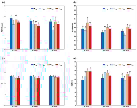 Characteristics of soil aggregates in grasslands with different depths and different enclosure years. G2a, enclosure of grassland for 2 years; G14a, enclosure of grassland for 14 years; G30a, enclosure of grassland for 30 years; G39a, enclosure of grassland for 39 years. Note: (a) presents the Mean Weight Diameter (MWD) of soil aggregates. (b) displays the Geometric Mean Diameter (GMD) of soil aggregates. (a,c) illustrates the Fractal Dimension (D) of soil aggregates. (d) shows the content of water-stable soil aggregates with a particle size greater than 0.25 mm. Different lowercase letters indicate the significant differences between different depths of each plot (p < 0.05).