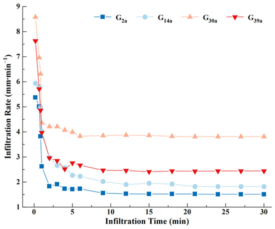 Moreover, the grassland that had been enclosed for 30 years exhibited the highest levels of organic matter content, root biomass, aggregate stability, and macro-aggregate count. Soil organic matter serves as a binder between soil particles, fostering the formation of macro-aggregates and enhancing aggregate stability, ultimately leading to improved soil porosity [47,53]. This is also the main reason for the strongest infiltration capacity of G30a (Table 3). Although G39a has a high porosity, the reduction in the number of its roots causes the soil pore structure to lose the support of the root system, resulting in poor stability [54]. Thus, the initial infiltration rate of G39a is comparatively high, yet it undergoes a 62.65% decrease during the infiltration process before stabilizing. In contrast, G2a, with a higher content of micro-aggregates, experiences these particles entering the soil concomitantly with water flow during infiltration. The subsequent dispersion of micro-aggregates results in pore blockage, causing a 51.21% decline in G2a’s infiltration rate during the initial stage. Notably, the average infiltration rate of G2a is lower than that of other grasslands, as evidenced in Figure 6.