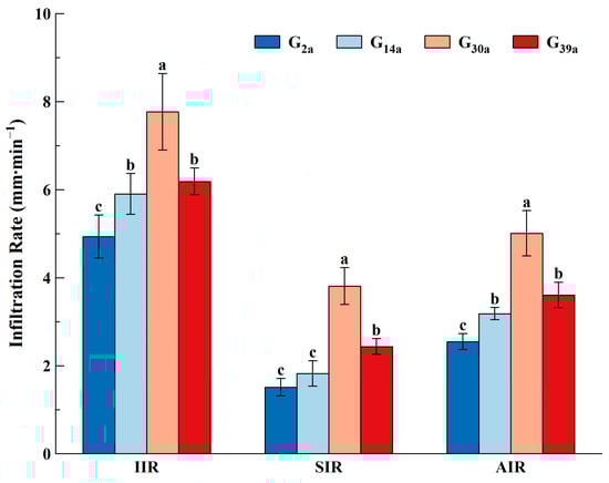 Soil infiltration characteristics of grassland with different enclosure years. G2a, enclosure of grassland for 2 years; G14a, enclosure of grassland for 14 years; G30a, enclosure of grassland for 30 years; G39a, enclosure of grassland for 39 years. IIR: initial infiltration rate; SIR: steady infiltration rate (10–30 min); AIR: average infiltration rate (0–30 min). Note: Different lowercase letters indicate the significant differences between different depths of each plot (p < 0.05).