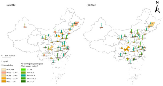 Per capita park green space and urban vitality in 35 large and medium-sized cities in 2012 and 2022.