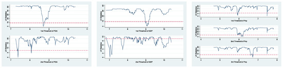 In Equations (3) and (4), denotes the threshold variable, δ represents the value of the threshold variable, and represents the indicator function, which takes the value 1 when the corresponding condition is met and 0 otherwise. The bootstrap method is used to conduct a likelihood ratio test for threshold significance [56].