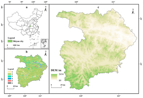 Overview map of the study area. Note: (a) shows the location of Shiyan City in China; (b) shows the spatial distribution of the six major ecosystems in Shiyan; (c) shows the spatial distribution of elevations in Shiyan. In (b): 1: agricultural ecosystems; 2: forest ecosystems; 3: grassland ecosystems; 4: water bodies and wetland ecosystems; 5: desert ecosystems; and 6: other ecosystems.