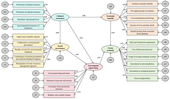 All research data have passed reliability and validity tests, as well as a confirmatory factor analysis. Therefore, based on the hypotheses, this study established a structural equation model comprising five variables, 24 observed variables, and 28 residual variables to test hypotheses H1–H6 (Table 6). Generally, if the critical ratio (C.R.) value is greater than 1.96, then the p-value is less than 0.05, indicating that the path coefficient is statistically significant at the 95% confidence level, confirming the validity of the path. The results show that the positive impact of cultural awareness on social governance is significant (β = 0.583, p < 0.001); the positive impact of cultural awareness on government supervision is significant (β = 0.233, p < 0.05); the positive impact of cultural awareness on economic benefits is significant (β = 0.597, p < 0.001); the positive impact of social governance on government supervision is significant (β = 0.450, p < 0.001); the positive impact of government supervision on the green economy is significant (β = 0.374, p < 0.001); and the positive impact of economic benefits on the green economy is significant (β = 0.346, p < 0.001).