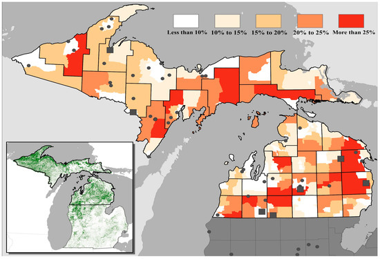 Figure shows the study area with the percentage of homes (by census tract) that use wood as their primary heat source (Source: American Community Survey 5-year estimates, 2020) [25]. The map also shows locations of regulated commercial-scale wood-fired boilers (dots) and biomass power stations or combined heat and power plants (squares). The inset map shows the outline of the study area and the concentration of forest cover in the Upper Peninsula and northern Lower Peninsula. Shaded green areas represent forest cover (Source: NOAA, 2016) [26].