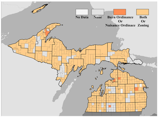 Several rural, sparsely populated communities in northern Michigan do not have zoning. These jurisdictions typically do not have staff to create, manage, and enforce a zoning code. A study by Locke and Rissman found that socioeconomic characteristics of communities in Michigan tended to be a predictor for whether or not those communities had adopted zoning [31]. Rural communities in Michigan that do not have zoning sometimes have other ordinances on burning or related nuisances. Although this study focused on zoning codes, we searched other related codes such as municipal and township ordinances, county building codes, and other local ordinances well. Descriptions of this process are found in the methods section below.