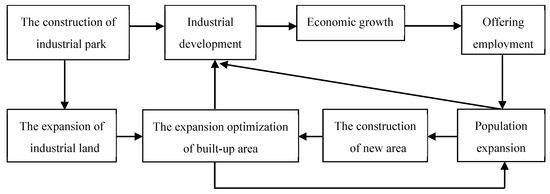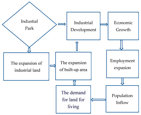 This study takes Xining City as an example to analyze the mechanism of how industrial park construction promotes urban population and land expansion based on the cumulative causation theory. Also known as the circular cumulative causation theory, this theory was first proposed by renowned economist Gunnar Myrdal in 1957 and later developed and formalized into models by Nicholas Kaldor, R.W. Dixon, and Gunnar Myrdal himself, among others. Myrdal and his colleagues believed that in a dynamic social process, there exists a circular and cumulative causal relationship among various socio-economic factors. A change in one socio-economic factor triggers a change in another, which in turn reinforces the initial change, leading the socio-economic process to evolve in the direction of the initial change, thus forming a cumulative and circular development trend [16,17,18]. Based on this concept, the analytical framework proposed in this paper is illustrated in Figure 1.