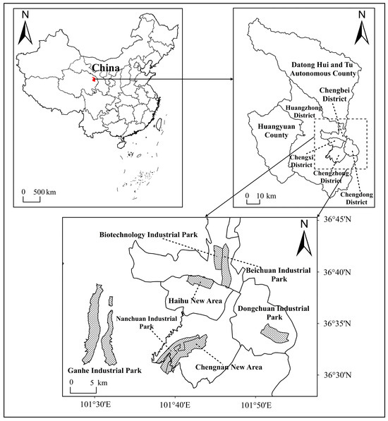 Since 2000, within the central city area composed of five municipal districts including Chengzhong District, Chengdong District, Chengxi District, Chengbei District, and Huangzhong County (District), Xining City has successively established the Xining (National) Economic and Technological Development Zone, High-tech Industrial Development Zone (Biotechnology Industrial Park, located in Chengbei District), Chengnan New Area, Haihu New Area, Beichuan Industrial Park, and other new urban functional areas. Among them, the Xining (National) Economic and Technological Development Zone adopts a diversified management model within one zone, including the Dongchuan Industrial Park located in Chengdong District, the Ganhe Industrial Park located in Huangzhong County, and the Nanchuan Industrial Park located in Chengzhong District (see Figure 2). Driven by the development and construction of industrial parks and new urban areas, Xining City has entered a high-speed phase of economic and population growth as well as built-up area expansion, providing an excellent sample for observing and studying the expansion of population size and urban environmental changes driven by industrial parks.