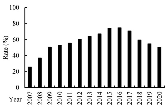As a carrier and engine driving rapid economic development, industrial parks have gradually played their role. In the 10 years before 2000, Xining City’s average annual GDP growth rate was 7.56%, with the highest year being 1998 at 10.1%. In other years, it did not exceed double digits and was not significantly different from the economic growth rate of Qinghai Province (see Figure 3). However, Xining’s economic growth continued to rise and gradually surpassed the provincial economic growth rate, reaching a peak of 18.2% in 2010. It maintained a double-digit growth rate for 16 consecutive years until it dropped to 9.8% in 2016, far exceeding the economic growth rate of Qinghai Province. This period roughly coincides with the development and construction of industrial parks, and the contribution of industrial parks to economic growth has gradually increased. In 2007, the industrial added value of the four major industrial parks accounted for 25.7% of the city’s total industrial added value. By 2009, the proportion exceeded 50% for the first time, reaching 50.51%, and peaked at 73.9% in 2016. After 2016, although the proportion of industrial added value from the parks in the city began to decline, it still accounted for about 55% by 2019, before the outbreak of the pandemic (see Figure 4).