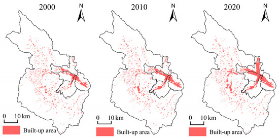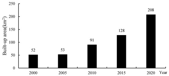 The construction of industrial parks and new cities relying on these parks has driven rapid expansion of Xining’s urban area. The built-up area expanded from 52 km2 in the early 2000s to 91 km2 in 2010 and reached 208 km2 by 2020 (see Figure 6 and Figure 7), representing an increase of 108% over the past decade. In contrast, during the entire 90s of the last century, the built-up area of Xining increased by only 2 km2. The expansion of the built-up area has been achieved through two modes, where one is the expansion driven by the construction of industrial parks themselves. The Dongchuan Industrial Park, the first established in Xining, has a planned area of 12.79 km2; the Biotechnology Industrial Park initially had a planned construction area of 10 km2; the Ganhe Industrial Park has a planned area of 10.89 km2; and the Nanchuan Industrial Park has a planned area of approximately 10 km2. By around 2010, except for the Dongchuan Industrial Park due to terrain constraints, the other three industrial parks had all undergone expansion, with the Biotechnology Industrial Park expanding by 23.5 km2, Nanchuan expanding to 31.39 km2, and Ganhe Industrial Park reaching 35.28 km2. The planned area of the parks increased from the initial 53.78 km2 to 101.06 km2.