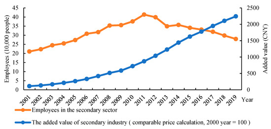 Different economic growth patterns and different industrial types have different labor demand intensities and labor intensity at different stages of development, leading to varying abilities to drive new employment through economic growth. Since 2013, Xining’s economy has entered a downward trend, and along with the decline in development speed, the scale of new employment brought by GDP growth has also shown a downward trend, manifested as a decline in the overall employment elasticity coefficient. From 2000 to 2013, the employment elasticity coefficient of economic growth in Xining was above 0.3 in most years, with the highest reaching 0.55 in 2011. After 2012, the employment elasticity coefficient gradually declined, with no year exceeding 0.3, and the highest in 2016 was only 0.27 (see Figure 9). Especially for the secondary industry, with industrial parks as the main carrier, after experiencing scale expansion, the number of employees peaked in 2011 and 2012 and then tended to decline (see Figure 10), contributing most significantly to the decline in the employment elasticity coefficient. It can be seen here that the decline in the employment elasticity coefficient is not only driven by the government’s proactive response and active promotion but also an objective requirement for industrial upgrading and development to a certain extent.
