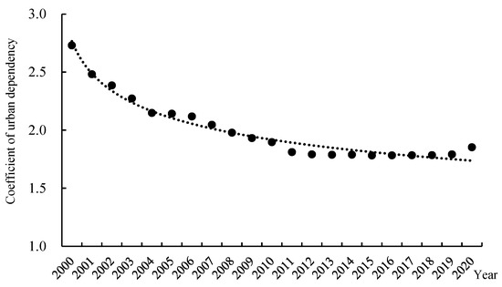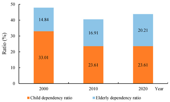 The dependency ratio in Xining has experienced a trend of first decreasing and then increasing. It declined from nearly 2.5 in the early 21st century to around 2.0 in 2008 and further dropped to its lowest point in 2016. Since 2016, it has gradually risen over the past five years, forming a “U”-shaped trend (see Figure 11). This changing trend has solid practical implications and is influenced by changes in the population’s age structure. As shown in Figure 10, the total dependency ratio in Xining was 47.85 in 2000 and then declined to 40.52 in 2010. The primary reason for this decline was the significant drop in the child dependency ratio due to the decrease in the birth rate. In 2020, the total dependency ratio rose again to 43.82, primarily due to the impact of population aging, where the elderly dependency ratio increased significantly while the child dependency ratio remained relatively stable (see Figure 12). The evolution of the population structure is the root cause of changes in the dependency ratio. The changes in Xining indicate that with the adjustment of China’s family planning policy, while the birth rate and child dependency ratio remain stable, the increasing trend of aging will lead to a rise in the dependency ratio. This will be an important factor in judging the future changes in urban scale in China.
