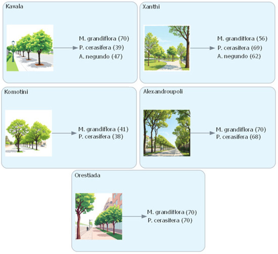 In the cities of Kavala and Xanthi, data from M. grandiflora, P. cerasifera, and A. negundo were collected. In Komotini, only data from the first two species were collected, since there were not many trees that were suitable for sampling of A. negundo. In Alexadroupoli and Orestiada, data from M. grandiflora and P. cerasifera were collected, since the A. negundo street tree allometry had already been analyzed in previous research [9]. Data were collected during the vegetative period in the summer of 2022. In total, 307 M. grandiflora, 284 P. cerasifera, and 109 A. negundo trees were sampled and measured in the context of the present study, distributed as shown in Figure 2.