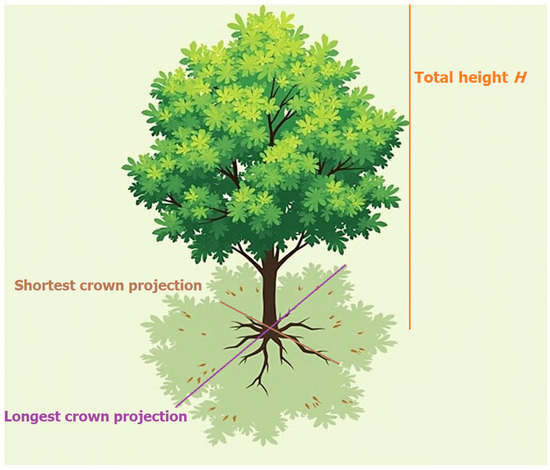 The trees were randomly selected from tree lines along roads (on pavements). Each selected tree had to satisfy certain conditions to be incorporated into the sample [9]. The tree had to be healthy and robust, without a deformed crown. Its crown had to grow freely, without any restrictions (buildings or other infrastructure, the crown of another tree, etc.). If the crown of the tree was in the vicinity of an obstacle, it would not be deformed, and its branches would not alter their direction because of the obstacle. Additionally, the tree had to have not experienced recent pruning, any injuries (human made or not), or any insect infestations. In each selected tree, the minimum and maximum crown diameter were measured by projecting the shortest and longest measurements along one axis, from the crown’s center to its edges, and their average was considered the tree crown diameter (crown width) [35]. Moreover, the total height of the tree was measured using the Blume-Leiss instrument (Haglöf Sweden AB, Långsele, Sweden). The measurements of individual trees are visualized in Figure 3.