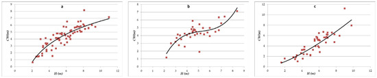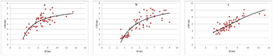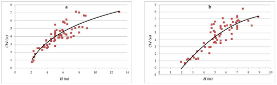 Ref. [14] developed allometries for seven species. The biometrical data were collected in urban areas of Great Britain. The R2 of the developed CW-H models was lower in most cases than the R2 values of the present study. In very few cases, the R2 values were over 0.60. The highest observed R2 value, when the total dataset for a species was used, was 0.67 for Fagus sylvatica, and for a species in an urban area, it was 0.65 for Quercus robur in Bridgend City [14].
