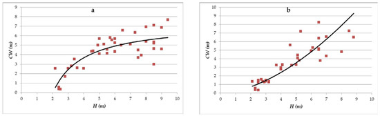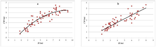 The previously described results contribute to the existing body of work on models involving tree dimensions. While numerous studies have focused on developing models that relate crown width to breast height diameter [7,8,14,15,39,40,41,42], this research addresses a gap in the literature by examining crown width–tree height (CW-H) relationships, an area less frequently explored [9,14]. This approach allows us to predict future space requirements more effectively, considering the vertical dimension of tree growth.