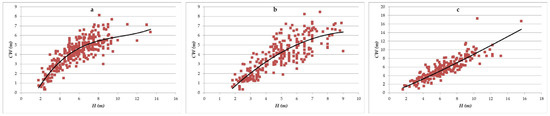 CW-H curves from the total dataset for each species. (a): CW-H curve for M. grandiflora; (b): CW-H curve for P. cerasifera; and (c): CW-H curve for A. negundo.