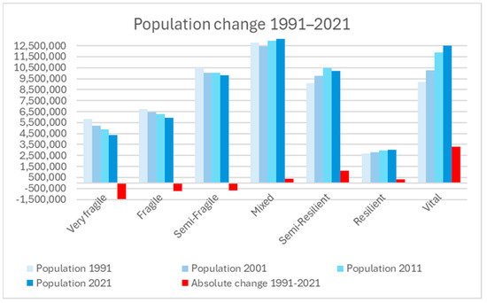 The Italian population revealed steady growth between 1991 and 2011 (from 56.8 to 59.4 million inhabitants), but in the last decade, this process was reversed (the total population decreased to 59.0 million in 2021). Over the 1991–2021 period, the very fragile cluster lost 1.4 million inhabitants (more or less, the fragile and semi-fragile groups decreased by the same amount). In contrast, vital municipalities gained 3.3 million new inhabitants (Figure 1).