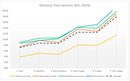 Relevant relations can be traced between demographic typologies and accessibility to services. Figure 2 confirms that higher fragility implies lower accessibility to essential services, such as primary and secondary schools, train stations and healthcare services. The average distance from these services of very fragile areas is more than double compared to the groups of resilient and vital ones. Dynamic economies and better transport infrastructures allow residents in vital and resilient areas to keep more frequent exchanges with nearby municipalities and for better mobility inside and outside their own municipalities. From a dynamic perspective, these disparities will widen so that service accessibility does not attract any more public or private investments due to the shrinking population.