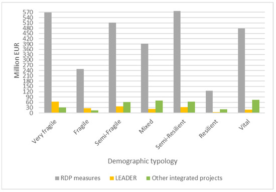 Distribution of RDP-committed funds (in EUR, 2014–2020 period) by typology of demographic dynamics. Source: authors’ elaborations from the database of funded investment projects 2014–2020.