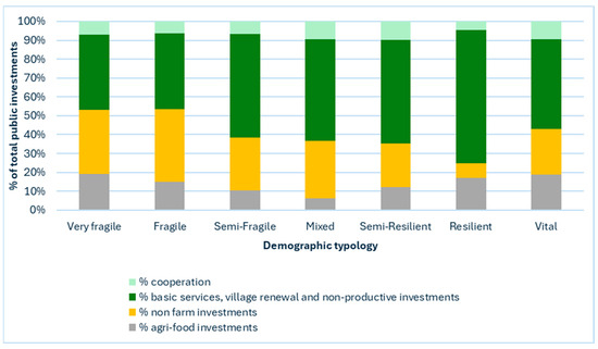 To answer the question about the role of rural policies, the allocation of funds for RDPs in Italian rural areas does not seem to be concentrated in specific demographic typologies (Figure 3). That means that there are no relevant differences between the resilient and fragile groups in the total allocation of funds. However, some interesting differences emerge, as the LEADER’s share is more significant in fragile areas, whereas other integrated projects (notably integrated agri-food chain projects) gain more weight in resilient areas.