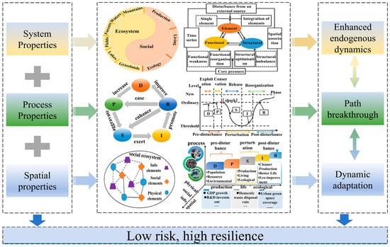 Since Holling introduced the concept of resilience to the social and ecological field, researchers have advanced theoretical frameworks for urban ecological resilience from various perspectives, including “urban scale, density and morphology” as well as “resistance adaptability resilience,” etc. [36,37]. UER represents a complex system comprising elements such as urban infrastructure and residents. This system exhibits dynamic and nonlinear characteristics in response to internal and external disturbances, facilitating the flow and exchange of information, materials, and energy both in the system and with the external environment through their interconnections [38,39]. Accordingly, the urban ecological resilience system exhibits characteristics related to system structure, processes, and spatial dimensions, as illustrated in Figure 1.