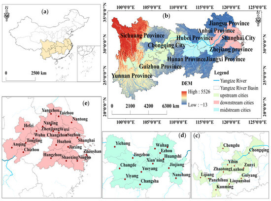 Figure 2. Overview of the study area. (a) Geographic location of the Yangtze River Basin in China. (b) Location of the study area. (c) Upstream cities in the research area. (d) Midstream cities in the research area. (e) Downstream cities in the research area.